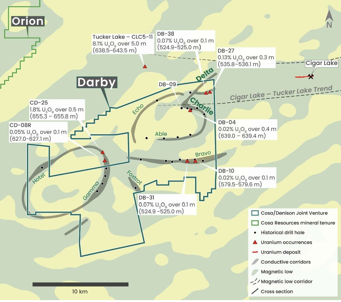 Located 10 kilometres west of the Cigar Lake Mine, Darby contains multiple prospective conductive trends and several historical intersections of weak uranium mineralization (Figures 1 and 2). Historical drilling has proven that many of these trends are highly prospective for uranium deposits characteristic of the eastern Athabasca Basin, yet the majority of the strike length has not been effectively tested. Work by Cosa in 2025 prioritized these trends and identified several historical drill holes with results that suggest proximity to uranium mineralization (See Cosa’s news release dated October 24, 2025). The primary objective at Darby in 2026 is directly following up the most favourable historical drilling results.